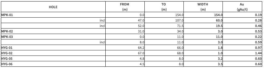 • The broad anomalous intersection MPK22-01 included intervals of 60 meters of 0.27 g/t Au and 19.5 meters of 0.46 g/t Au